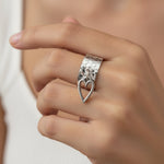 Bold yet elegant, this adjustable ring features a stunning hammered texture for a modern, handcrafted feel. A delicate silver open heart charm dangles from the band, adding a touch of movement and sophistication.