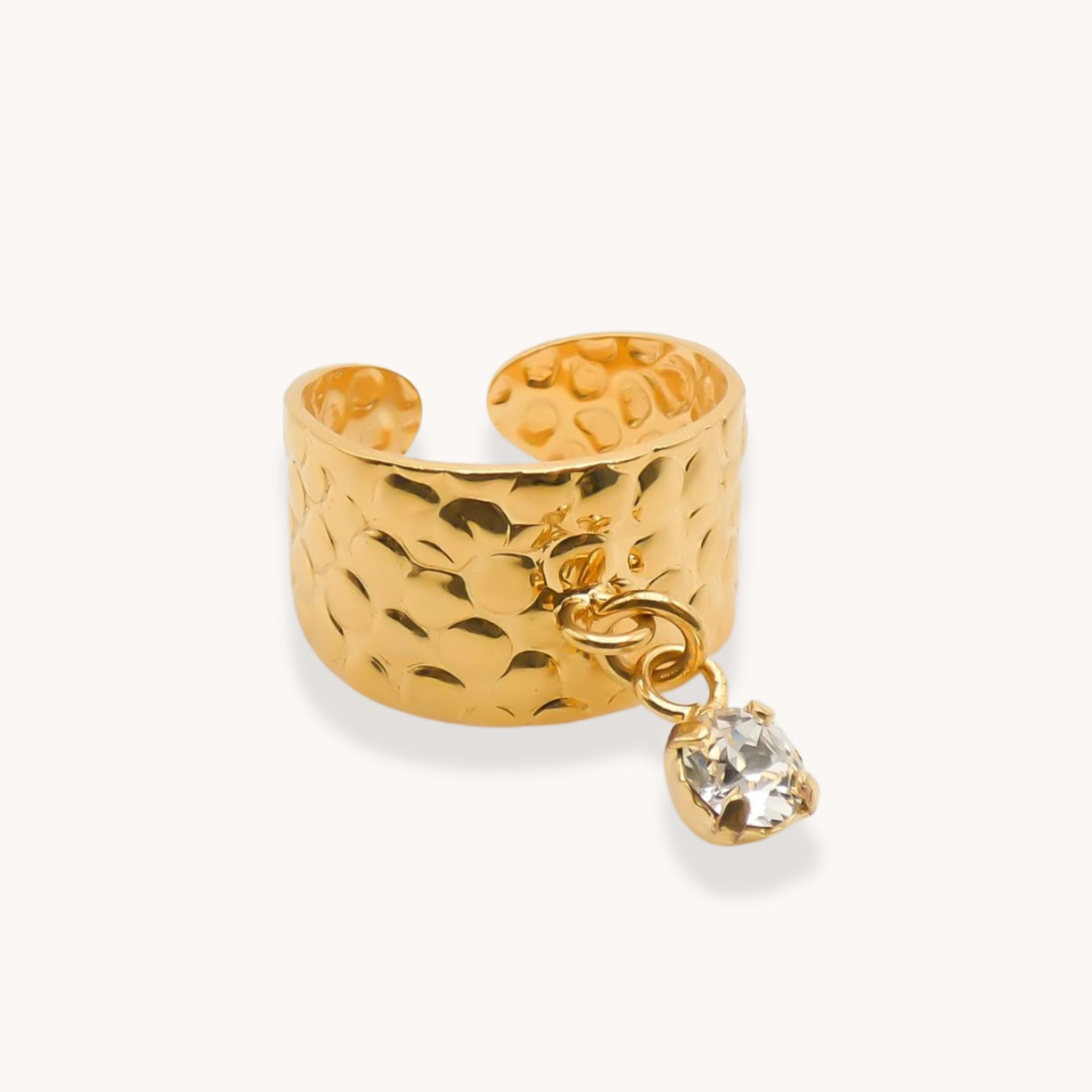 Add some charm to your fingers with our thick banded hammered ring with a birthstone crystal charm.