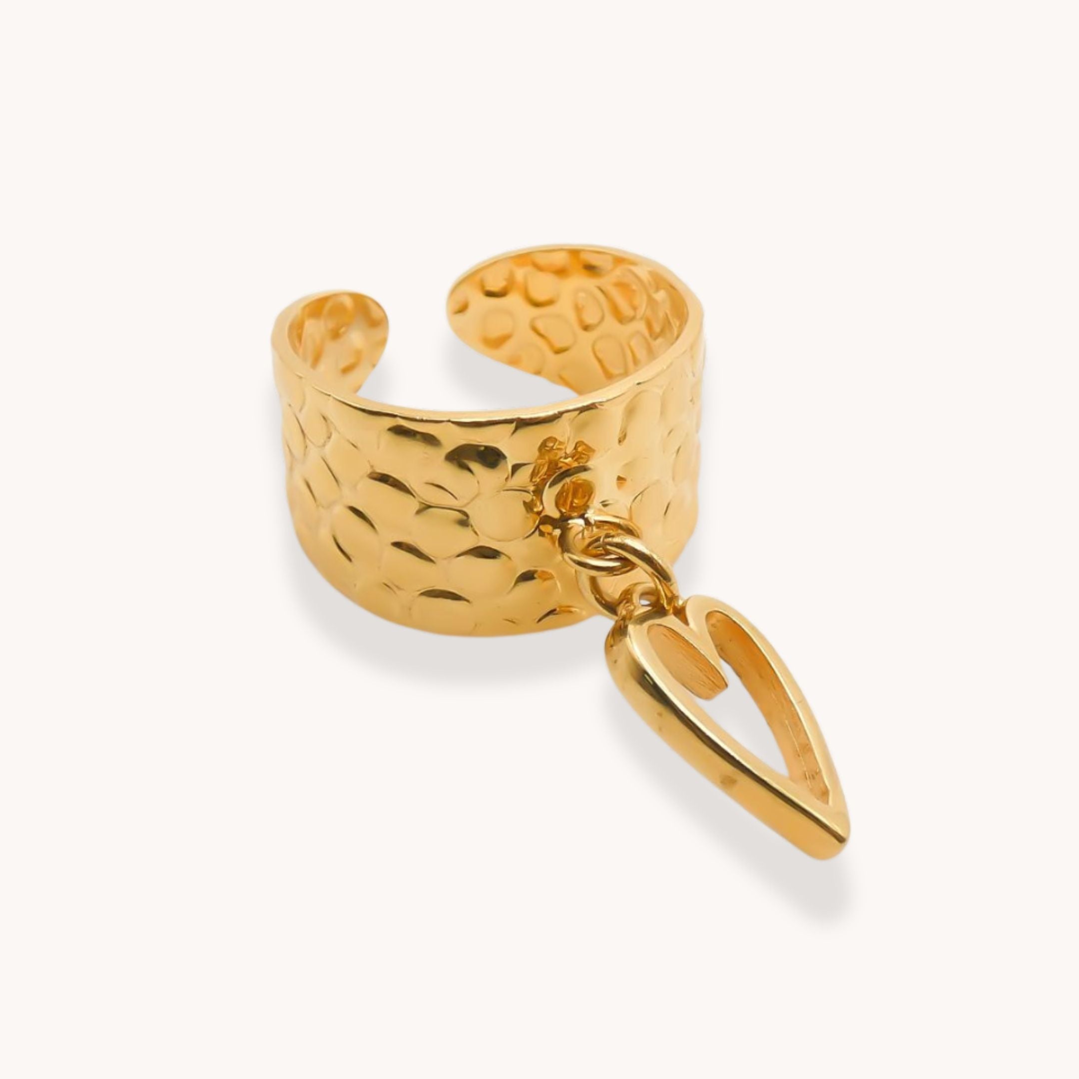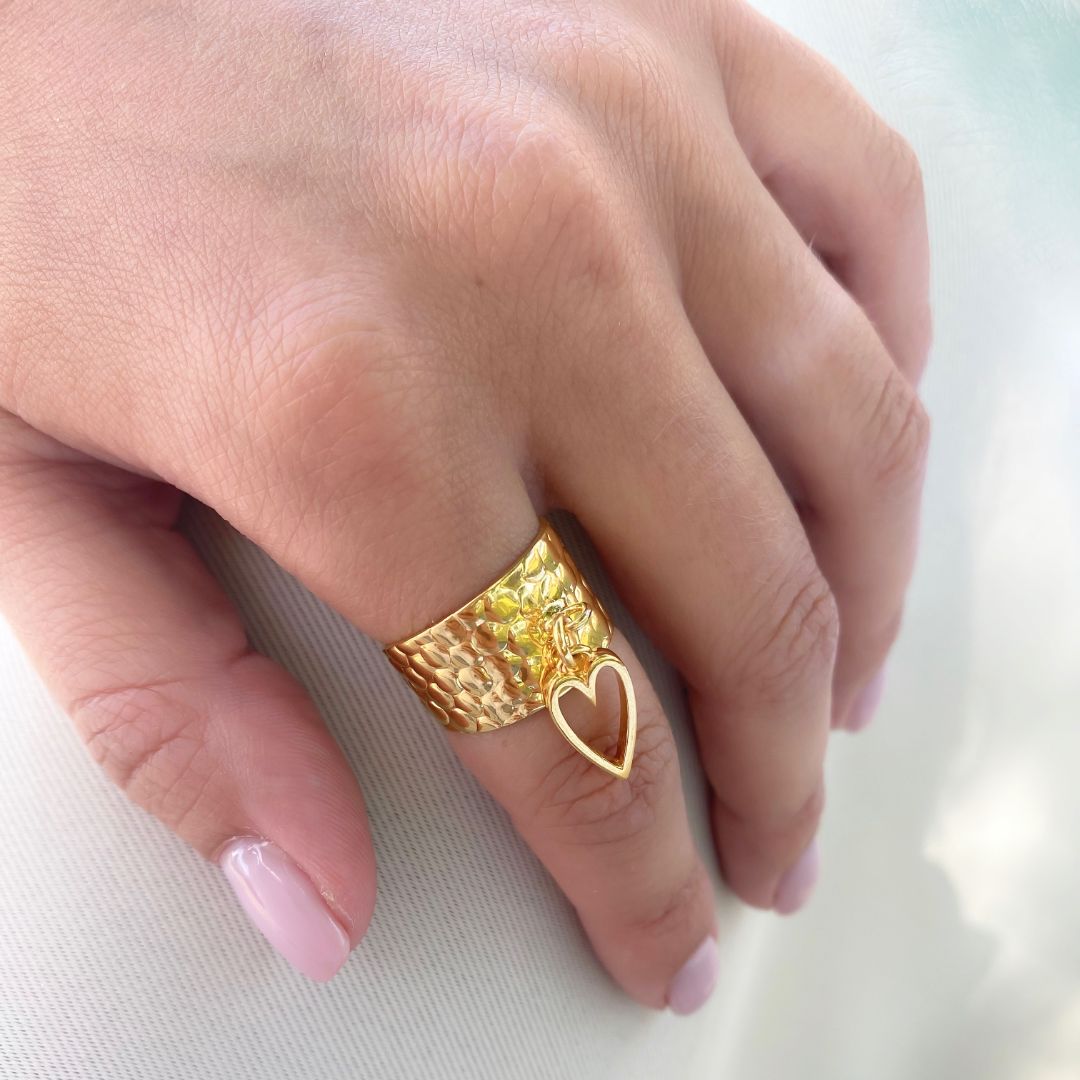 Add some charm to your fingers with our thick banded hammered ring with a mini open heart charm.