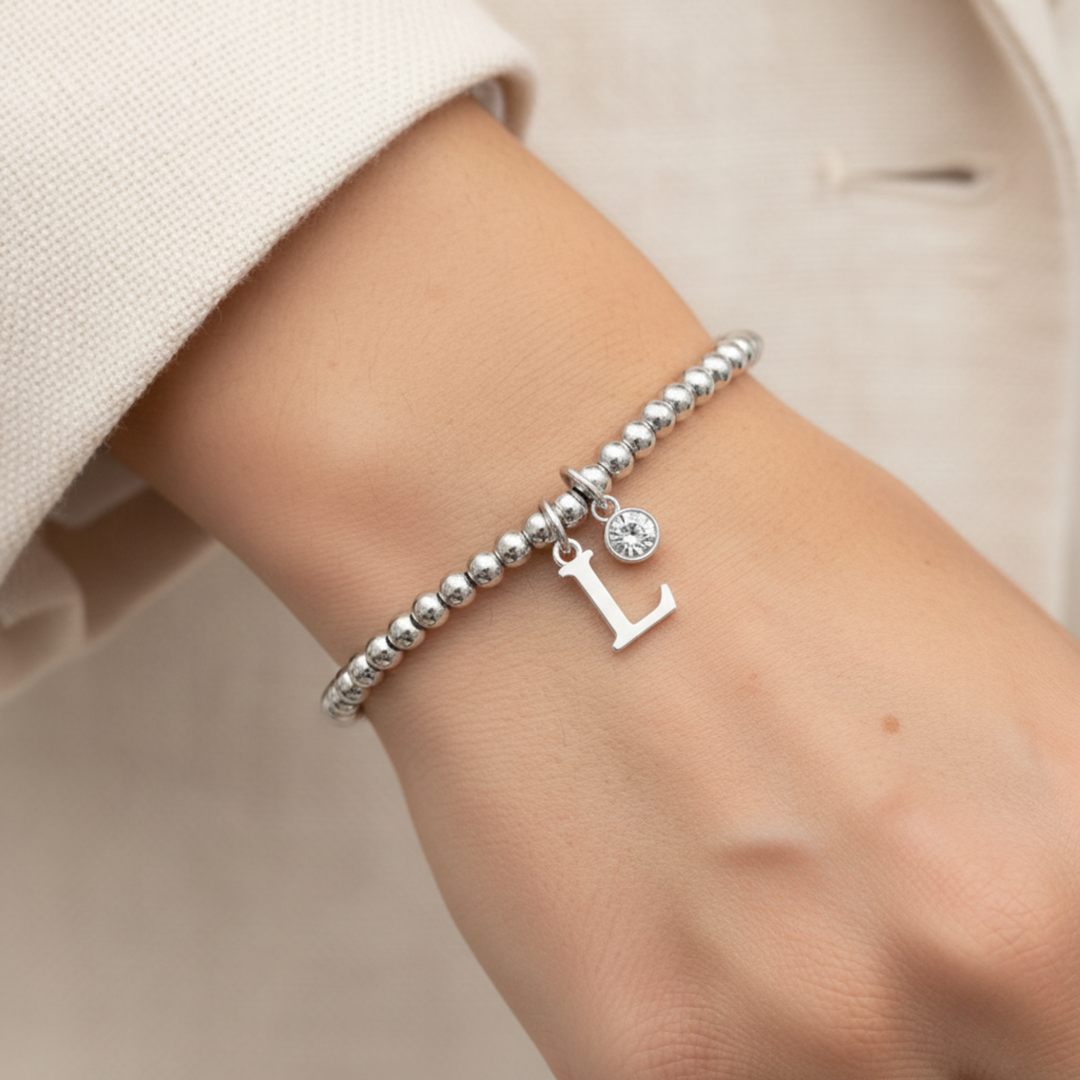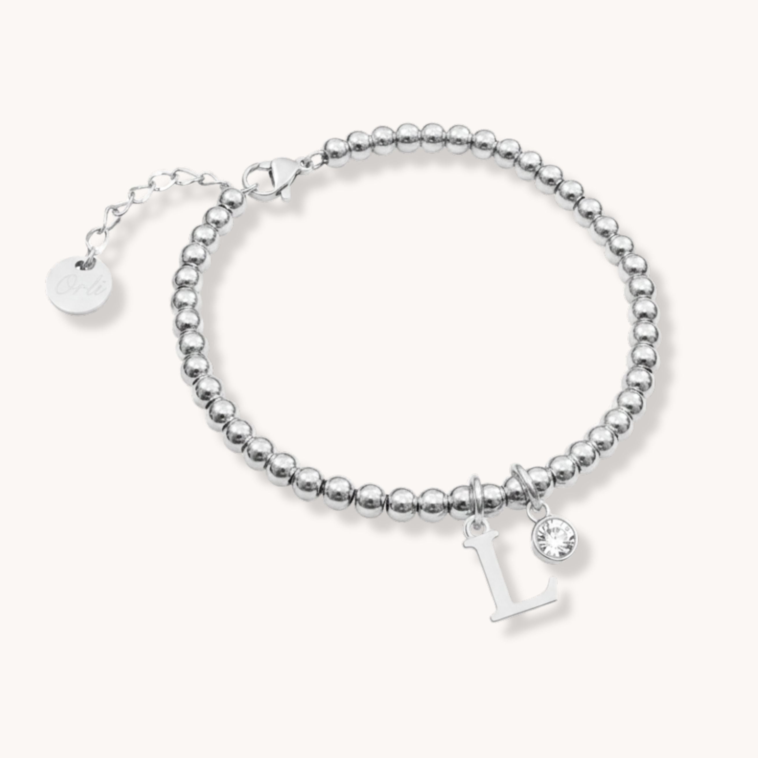 A silver beaded initial bracelet that shines with sentiment — wear it solo for understated elegance or stack it with your favourites for a personalised look.