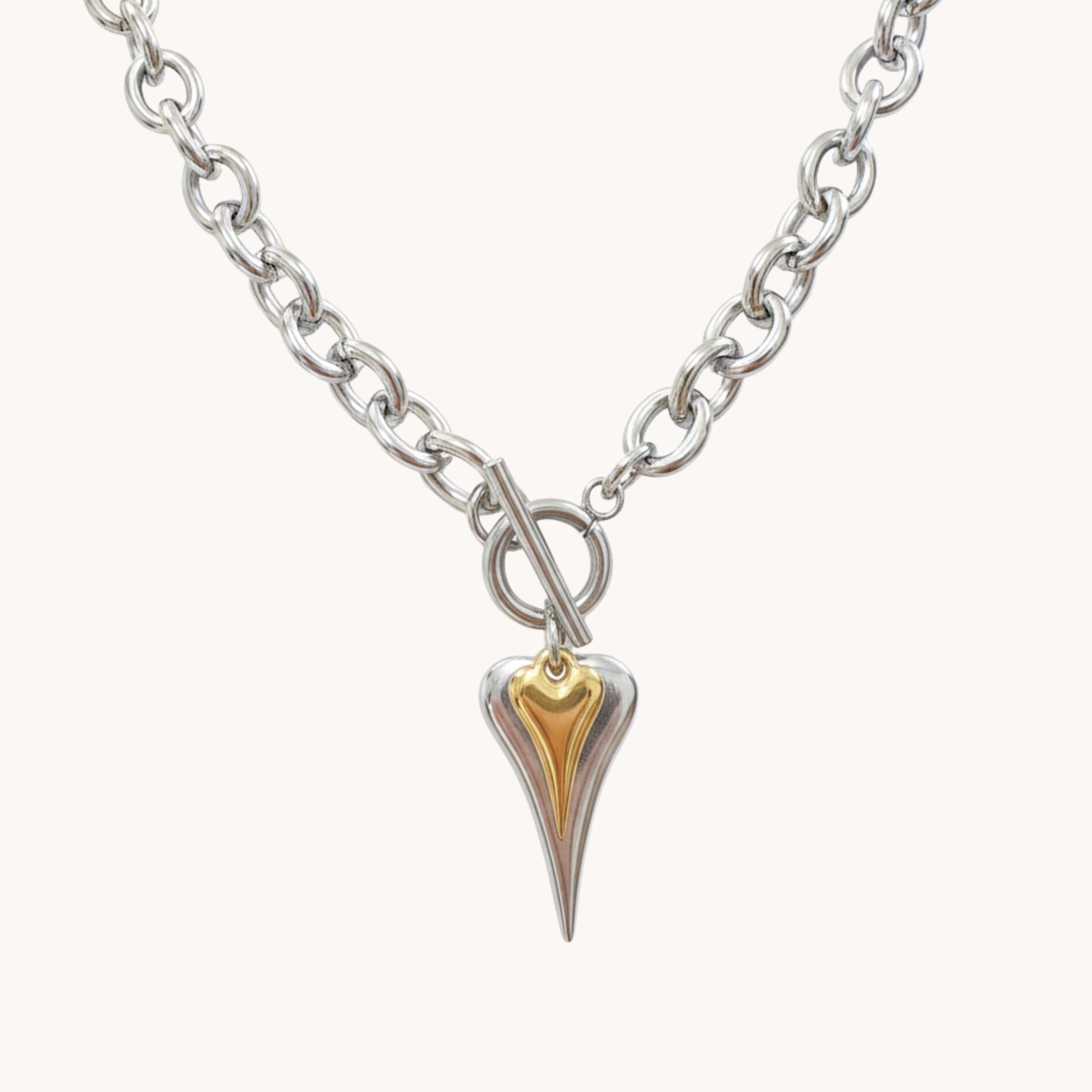 A mixed-metal heart necklace that’s sculptural, symbolic and made to stand out — perfect for gifting or adding statement edge to any look.