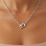 The Twisted T-Bar Necklace in Silver features an elegant paperclip chain and a sleek twisted toggle clasp for a refined yet contemporary finish.
