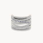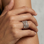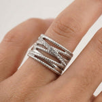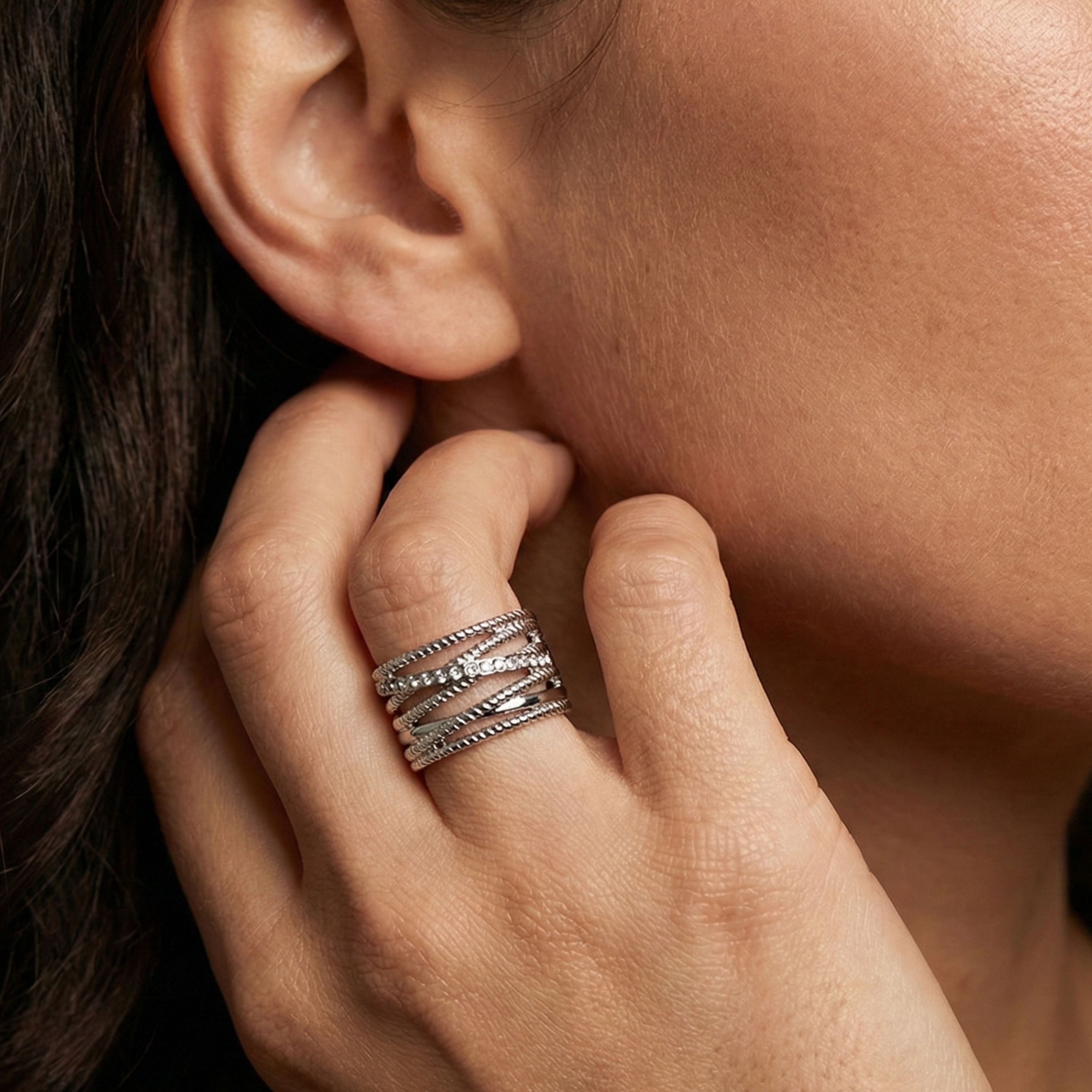 A sleek crossover ring adorned with shimmering crystals, perfect for adding a touch of elegance to any outfit.