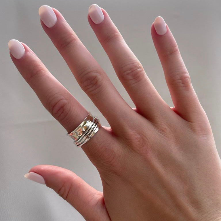 Sterling silver 925 spinner ring.  This classic ring has a thick hammered band, with 3 spinning bands.