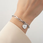 The Classic Heart Engravable Long Link Bracelet in Silver features a statement long-link chain finished with a polished heart charm — engravable with a name, date or initials for a personal touch. Crafted from premium stainless steel, it’s waterproof, durable and made for everyday wear.