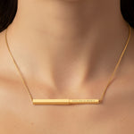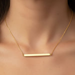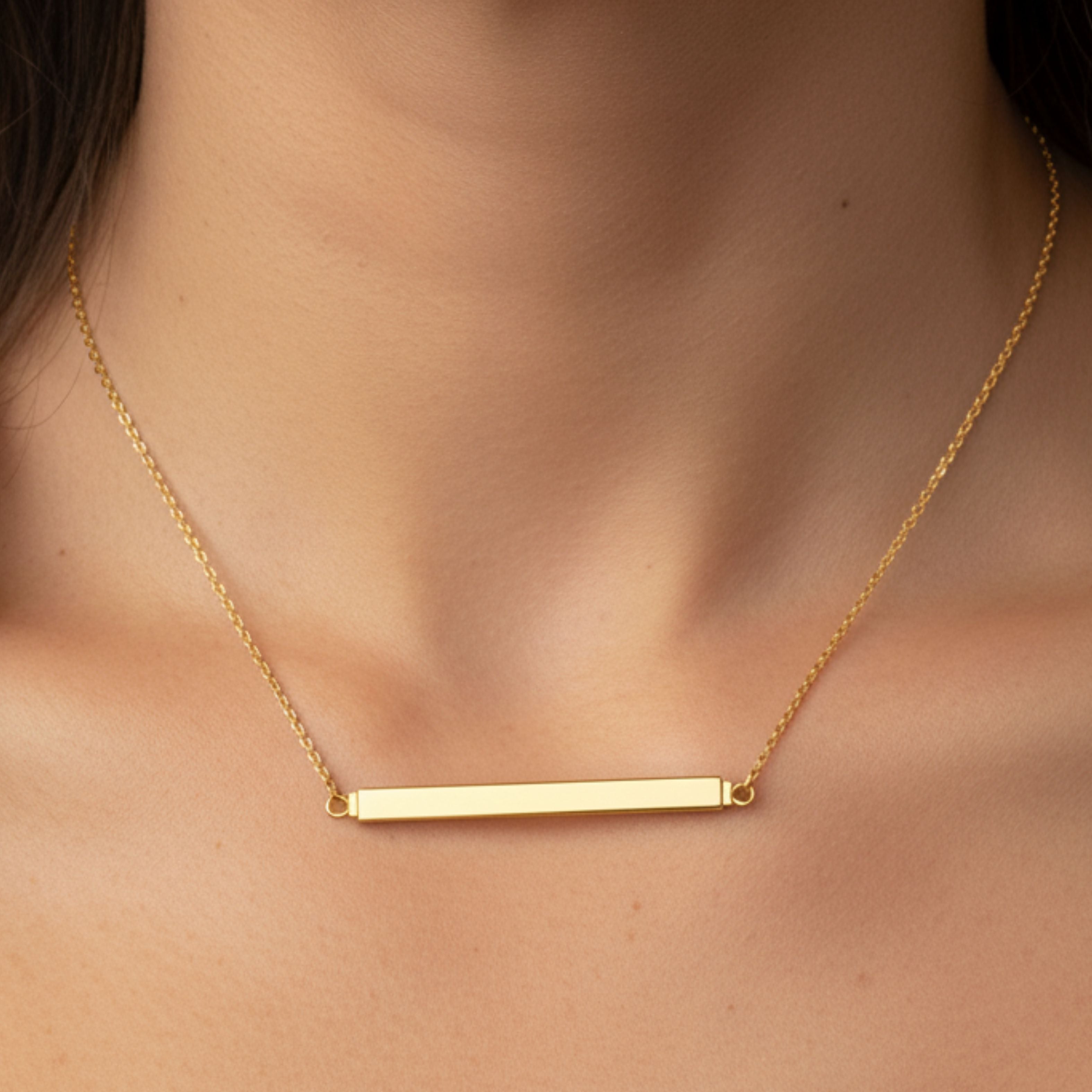Design: Slim horizontal bar pendant on a fine chain, polished to a radiant shine