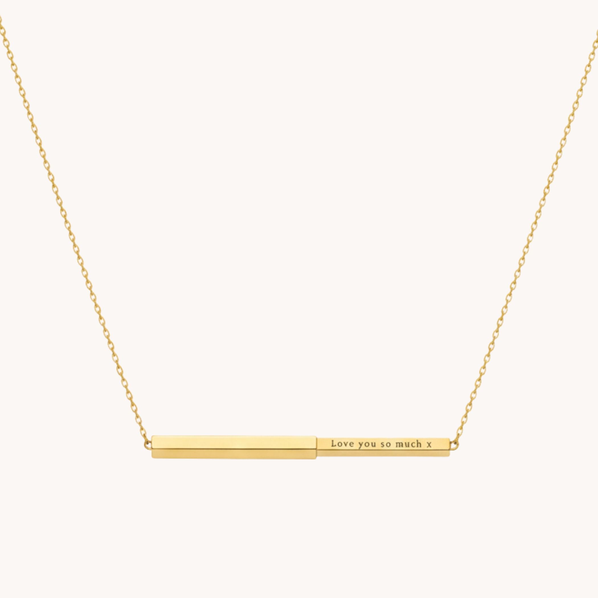 A classic beauty with a secret sentiment. Our Hidden Message Necklace in gold features a sleek bar that hides your engraved words on the reverse – a personal message only you know is there. Effortlessly elegant, with a warm golden glow that complements every look.