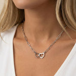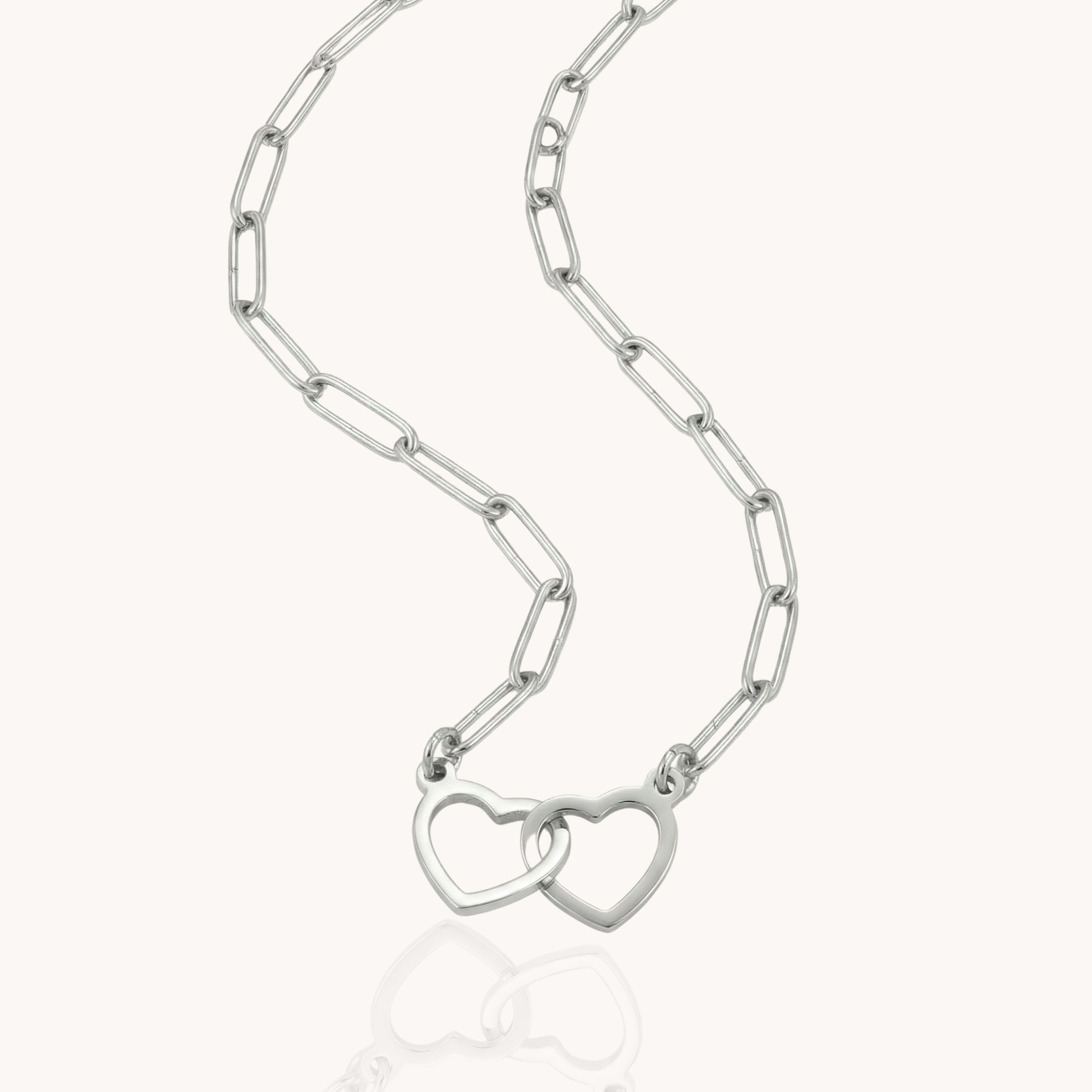 The Interlinked Heart Paperclip Necklace in Silver features a modern paperclip chain finished with two intertwined hearts — a beautiful symbol of love, connection and strength.