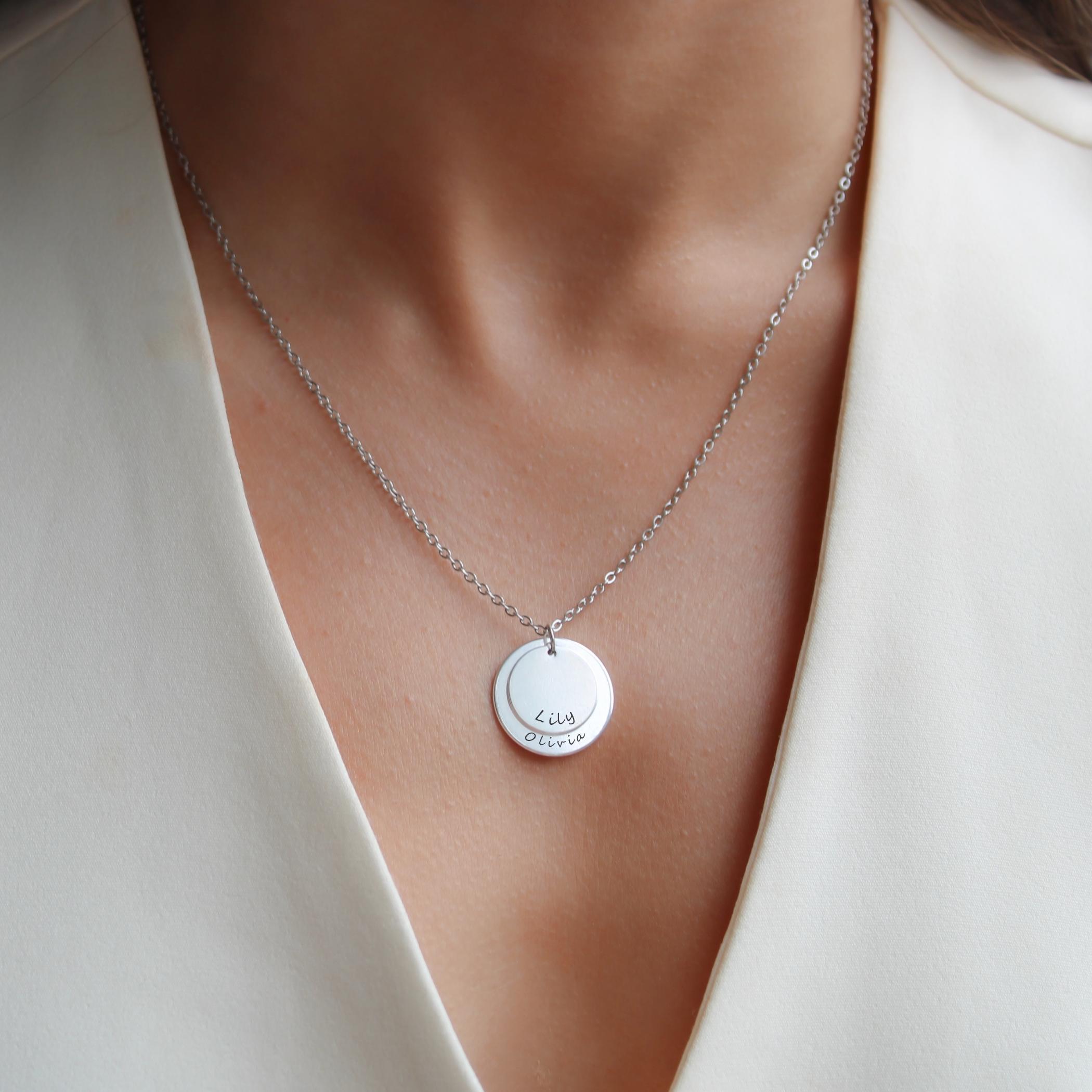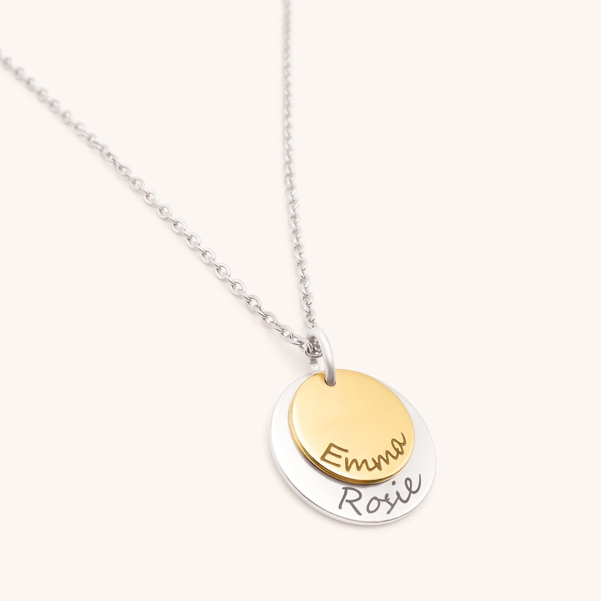 The Rosie Double Disc Necklace is an elegant personalised piece, perfect for engraving names, dates or meaningful words.