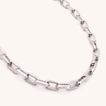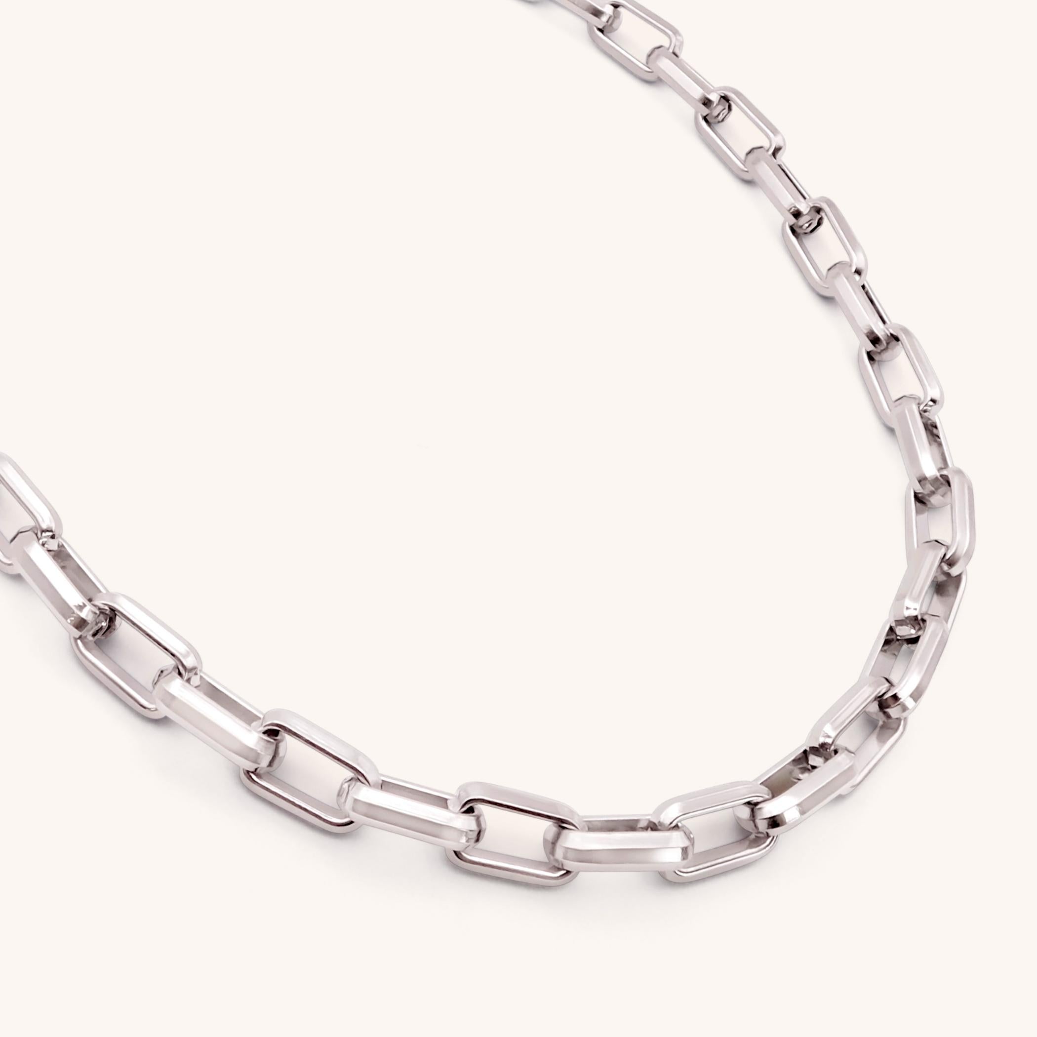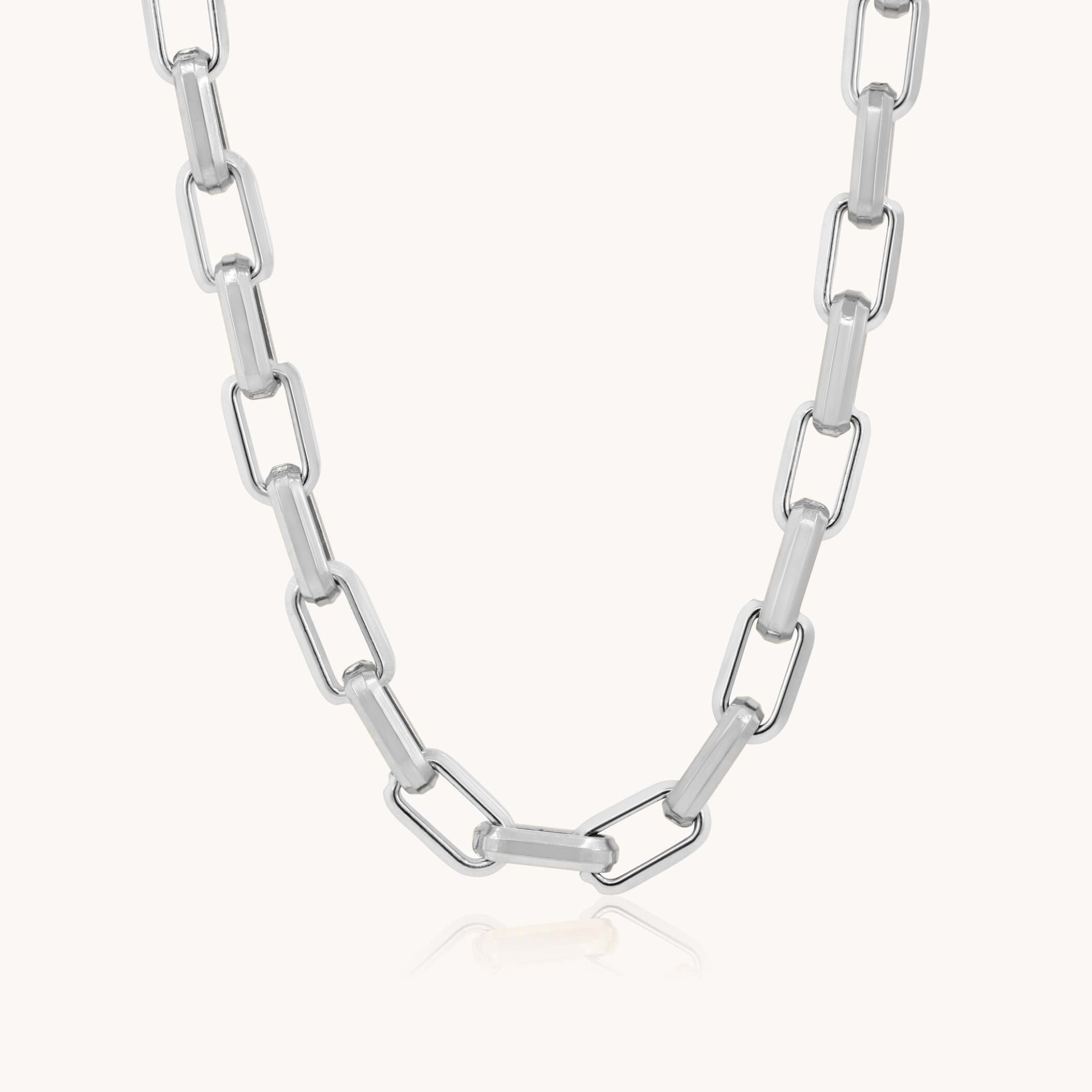 The Square Link Necklace in silver is a modern statement piece designed to elevate any look.