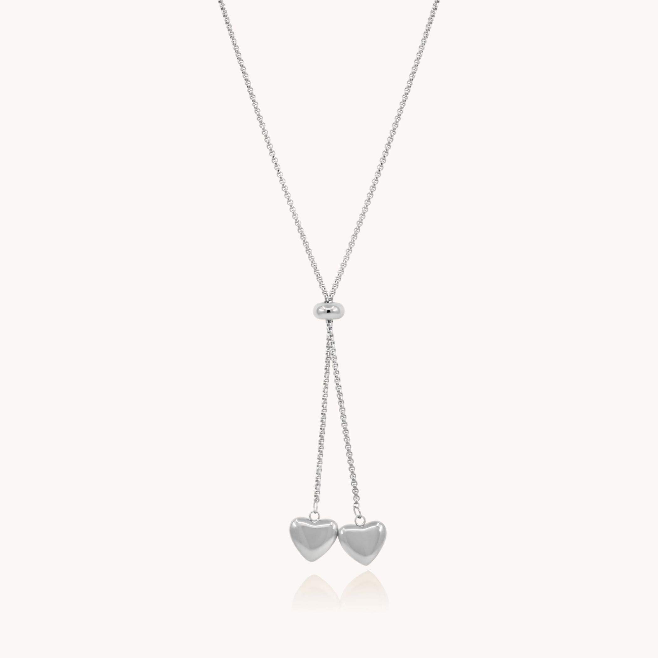 The Twin Hearts Adjustable Necklace in Silver features two interlinked heart pendants suspended from an elegant adjustable chain. A romantic piece that’s perfect for layering or gifting, designed to celebrate connection in style.